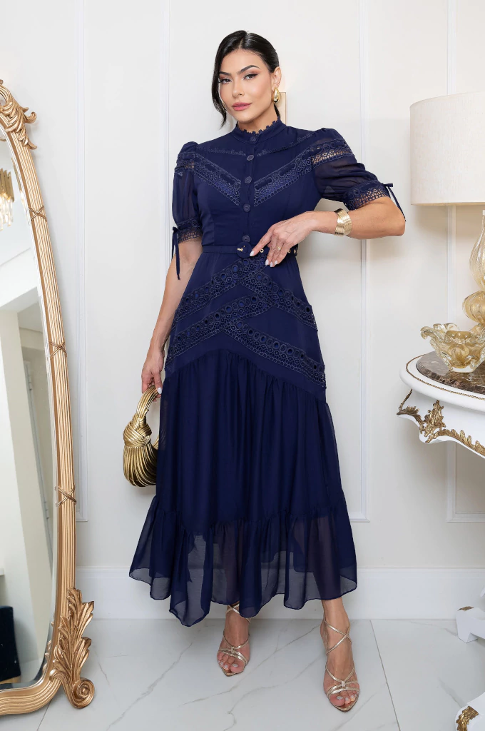 Um vestido fluido, leve e delicado, apresentado em uma cor suave que transmite serenidade e conforto. Totalmente forrado e finalizado com acabamento embutido, ele destaca uma construção impecável. A gola alta é enriquecida por renda guipir, harmonizando-se aos botões funcionais forrados e aos delicados detalhes em guipir aplicados no busto e nas mangas. As mangas curtas recebem um toque romântico com punhos em guipir e um gracioso lacinho em chiffon. O cinto forrado com fivela redonda valoriza a cintura, enquanto a saia em modelagem semi sereia confere elegância ao movimento. Finalizando a peça, a pala da saia é trabalhada em renda guipir em desenho simétrico, criando um visual refinado e atemporal.