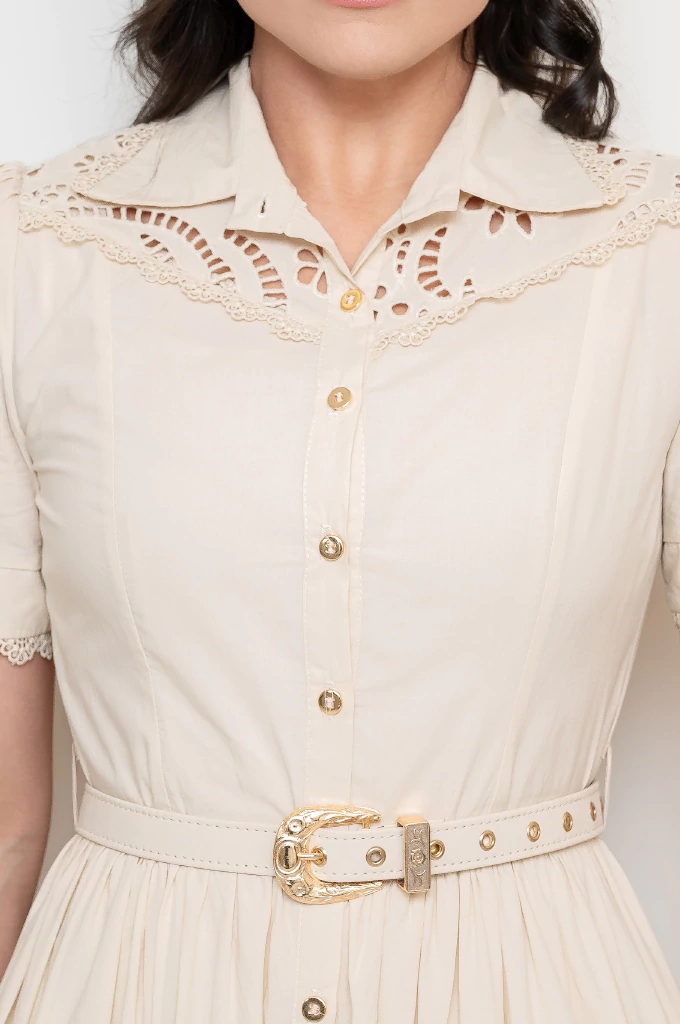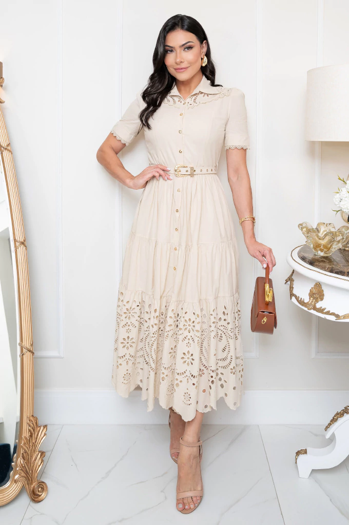 Um vestido midi encantador em modelagem chemise, com abertura frontal por botões funcionais dourados, que conferem um toque de sofisticação à peça. Seu design delicado apresenta gola alta Peter Pan, e o busto é ricamente adornado com acabamento em algodão bordado e renda guipir no decote, acrescentando charme e feminilidade. As mangas bufantes curtas com punhos finalizados em guipir reforçam a delicadeza do modelo. O vestido acompanha cinto com fivela e passantes dourados, que realçam a silhueta com elegância. A saia ampla e fluida, estruturada em modelagem três marias, exibe um belíssimo barrado em algodão bordado com desenhos simétricos, que valoriza o movimento e o acabamento artesanal da peça. Confeccionado em fibra natural, o tecido proporciona toque suave e conforto ao vestir. Acompanha camisola em forro de helanca, garantindo discrição e leveza. Um vestido que traduz o equilíbrio perfeito entre sofisticação, romantismo e delicadeza.