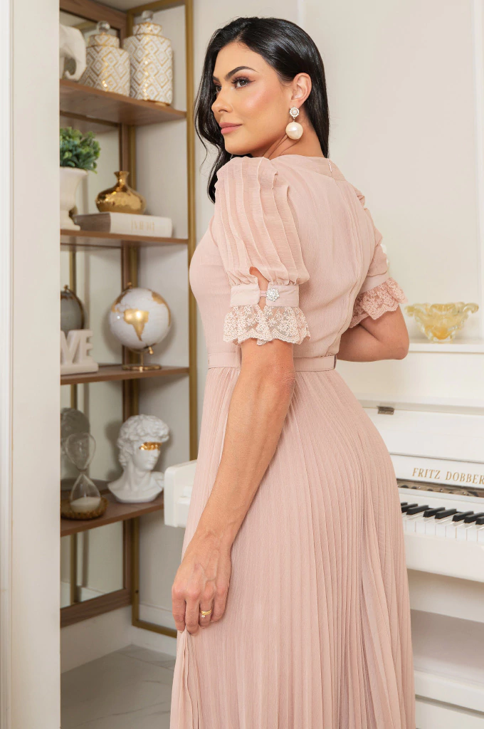 Uma peça fina, sofisticada e luxuosa, com acabamento de alta costura. Decote redondo com detalhes na parte de trás aplicados em termocolante. Mangas plissadas com botões em formato de flores com strass. O busto possui um leve franzido na gola, valorizando a silhueta. Acompanha cinto forrado com fivela quadrada. Saia plissada no comprimento super mídi. Fechamento em zíper.