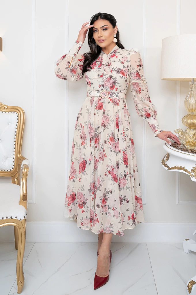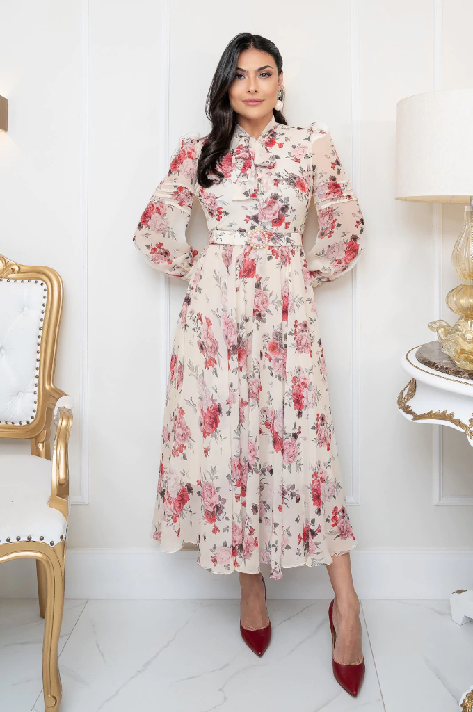 Vestido mídi no estilo lady like, confeccionado em tecido leve, fluido e delicado, com acabamento refinado. As mangas longas recebem detalhes diferenciados: punhos com botões de pérolas e babadinhos sutis, além de preguinhas na parte superior que enriquecem o caimento. A gola alta é finalizada com um delicado laço, acrescentando charme e feminilidade. O cinto forrado com fivela de pérolas valoriza a cintura com graça. A saia em modelagem godê garante movimento elegante, acompanhada de anágua como forro, que proporciona conforto e discrição. A parte superior do vestido também é forrada, reforçando o cuidado nos detalhes.