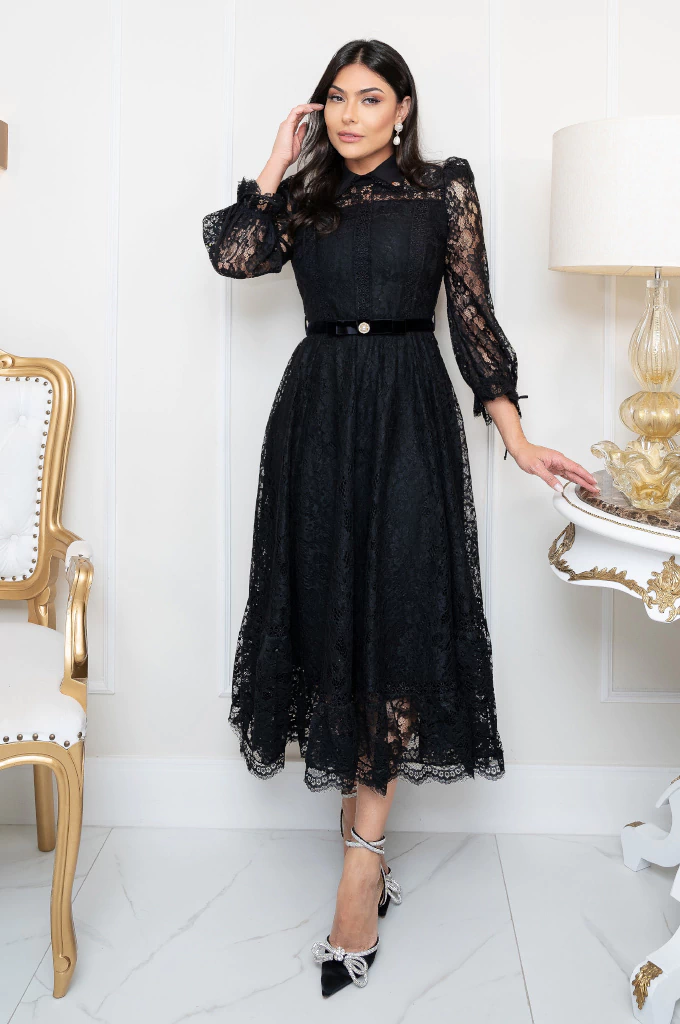 Um vestido encantador, confeccionado inteiramente em renda chantilly com delicados desenhos florais. Sua modelagem lady like valoriza e alonga a silhueta, trazendo feminilidade e sofisticação. O comprimento super mídi completa o visual com elegância. Os detalhes em renda guipir formam um belo mix de texturas em todo o vestido, enriquecendo cada recorte. A gola Peter Pan é trabalhada em renda guipir, enquanto o busto conta com recortes e interferências da mesma renda, destacando o cuidado nos acabamentos. As mangas 3/4 são finalizadas com laçarotes no punho, trazendo um toque gracioso. O cinto em fita de veludo, com delicado botão de strass no centro, valoriza a cintura com charme. A saia godê possui barrado todo trabalhado em renda, e acompanha anágua para forro, garantindo conforto e discrição.