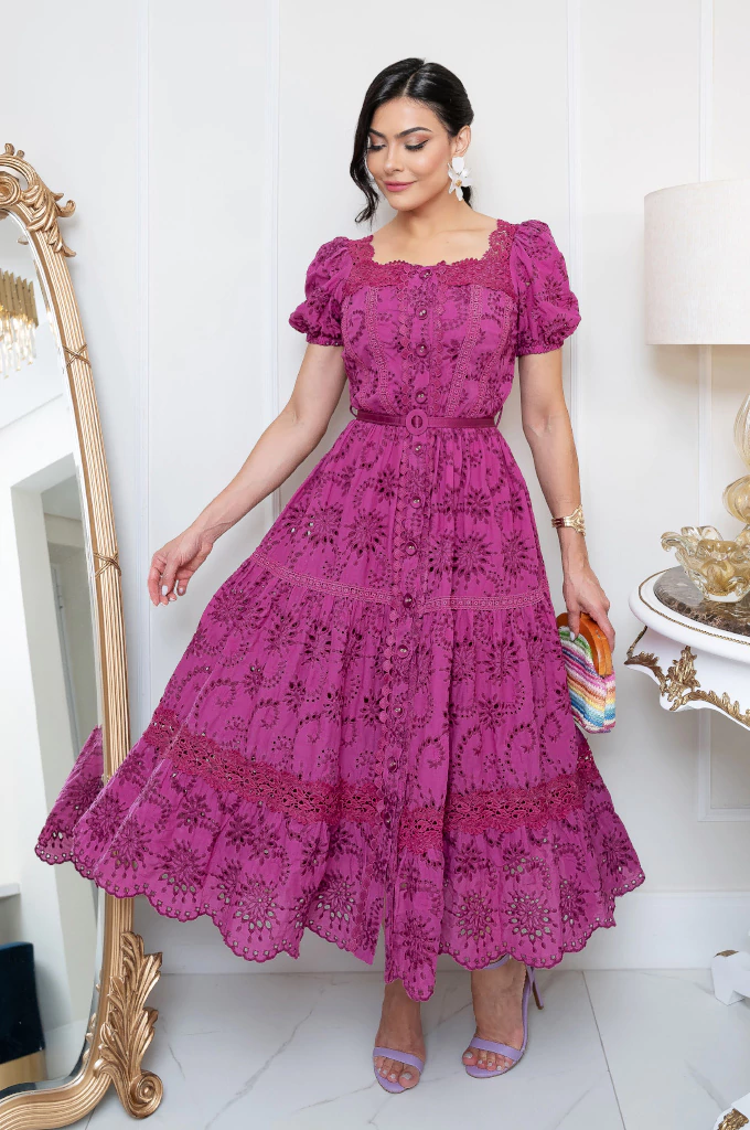 Um chemise que une delicadeza e sofisticação em cada detalhe. Confeccionado em algodão de toque suave, o vestido apresenta um trabalho primoroso em renda guipir, que enriquece toda a peça com um ar clássico e atemporal. Os botões forrados, em perfeita harmonia com o cinto igualmente forrado e finalizado com fivela redonda delicada, acrescentam um charme exclusivo e um acabamento impecável. A saia em três Marias confere movimento gracioso, com barrado realçado por renda guipir e detalhes em laise que reforçam o romantismo da composição. As mangas curtas garantem frescor e conforto para os dias mais quentes, enquanto a cor vibrante e alegre ilumina o visual de forma elegante. Acompanha uma veste em formato de camisola, funcionando como forro, para assegurar discrição, conforto e um caimento perfeito. Um vestido criado para mulheres que apreciam a beleza do clássico, com o toque romântico que define a essência da Closet Midy.