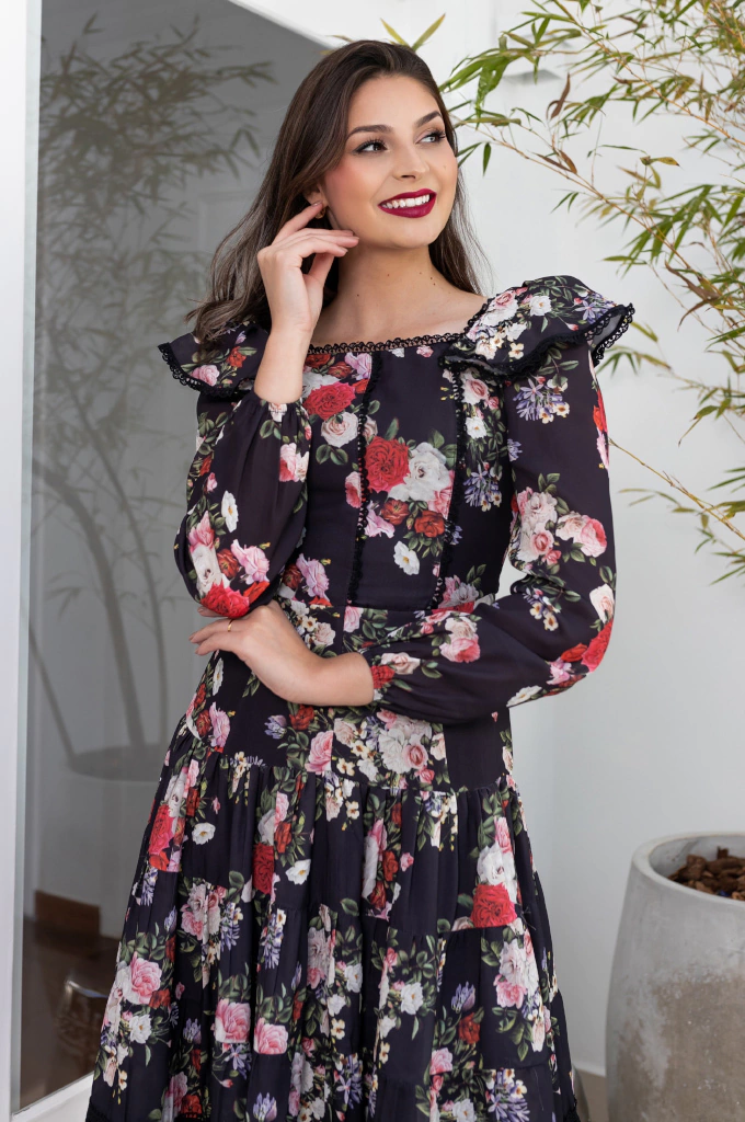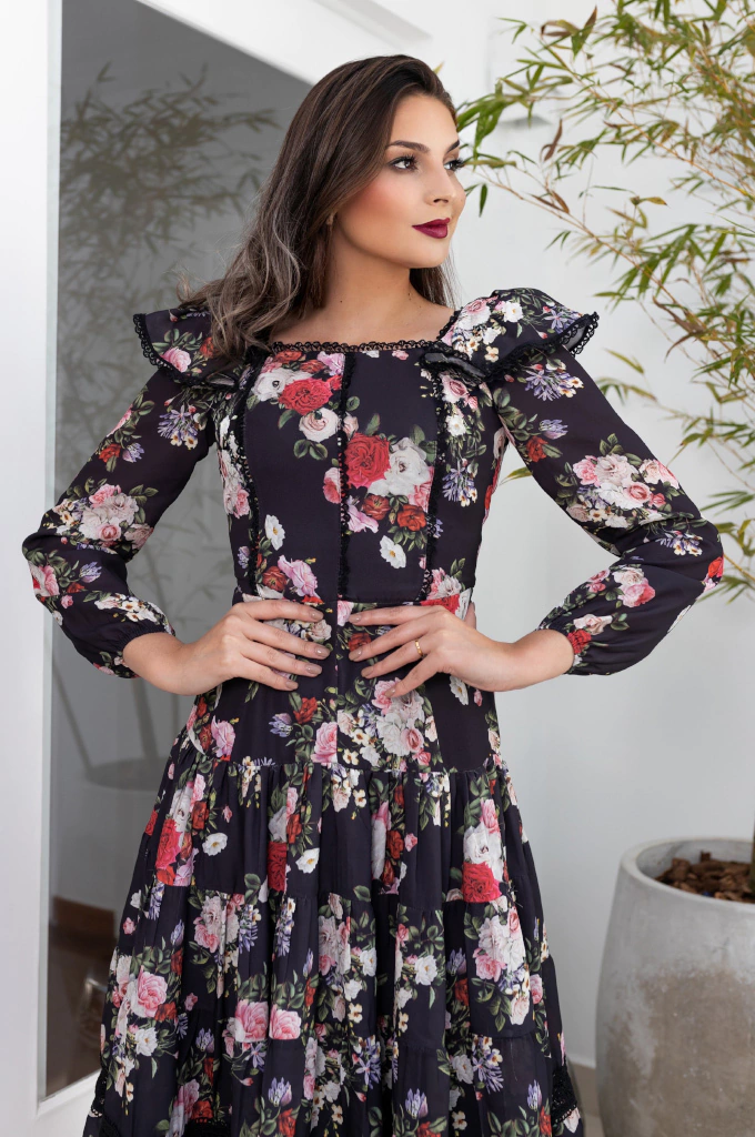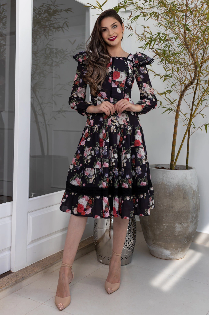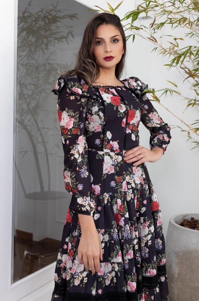 Vestido midi em modelagem lady like com decote quadrado e trabalhado na renda guipir no busto e no decote. Manga com detalhes de babadinho franzido e manga comprida com elástico no punho para dar acabamento. Saia 4 Marias trabalhado em franzido e renda guipir no barrado. Vestido em fundo preto com floral vermelho e rose em tons românticos.